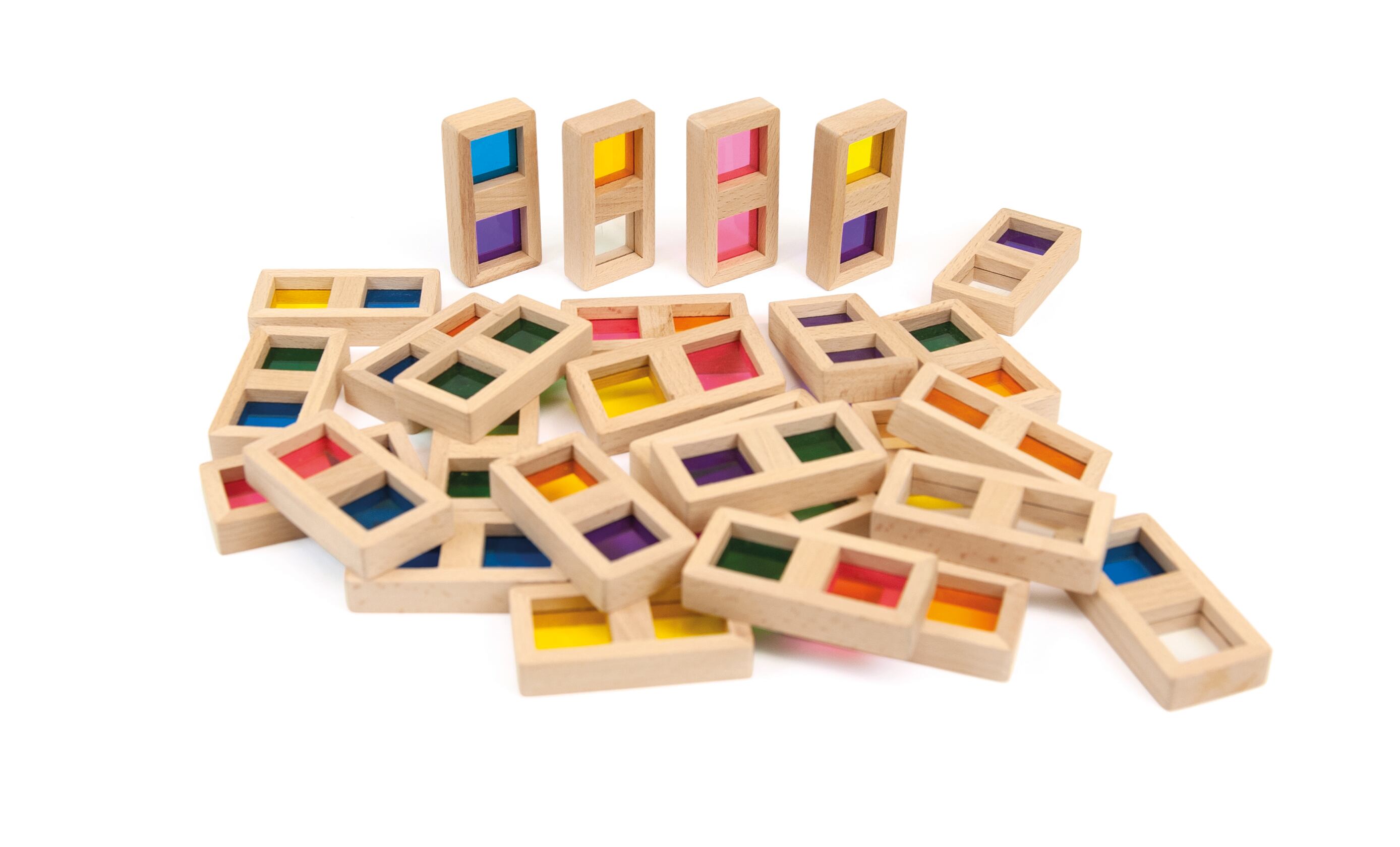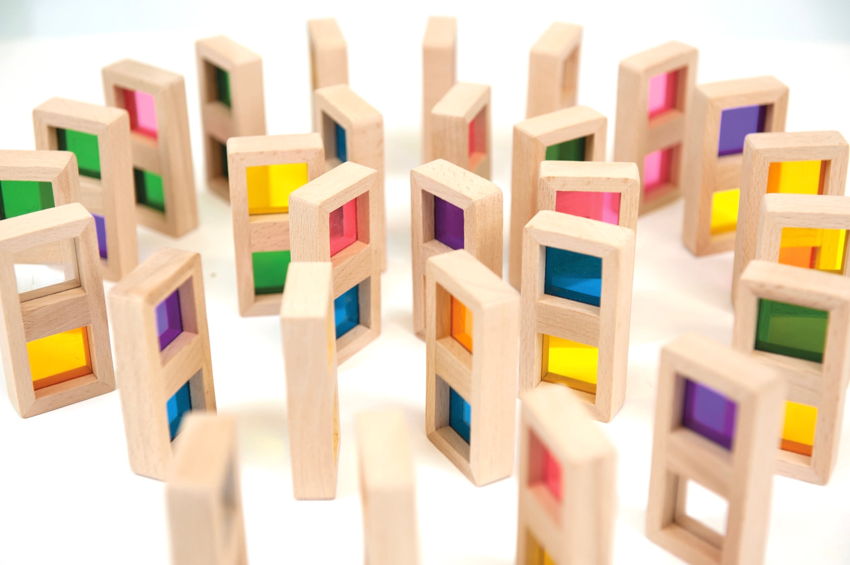 アクリル部分は光を通すので、床や壁に映る色で遊んだり、重ねて色の変化を楽しむこともできます。