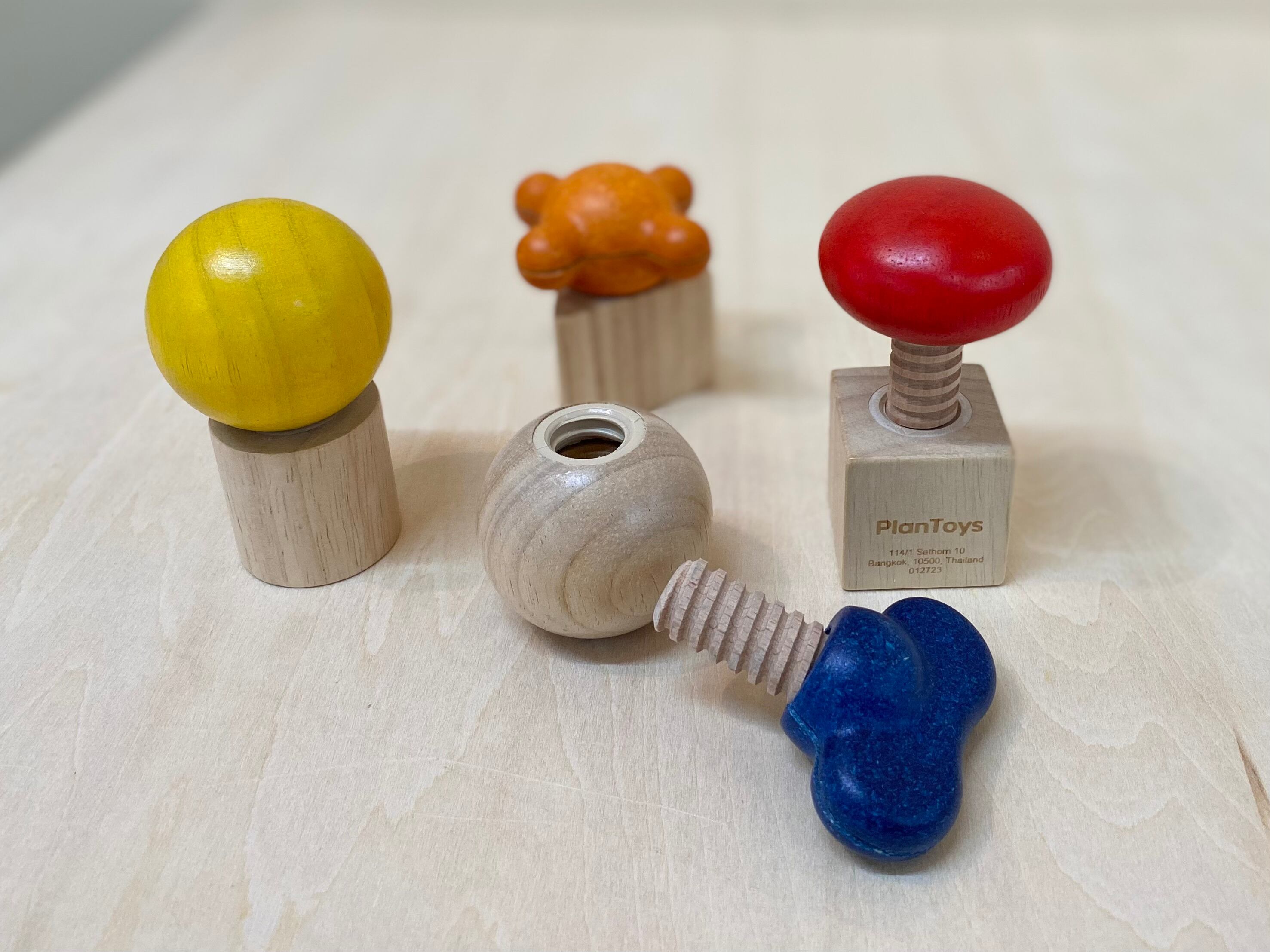 手のひら全体で握るように掴むものもあれば、何本かの指を使って回すものもあり、ネジネジして遊びながら、いろんな「ひねる」を経験できそうです。