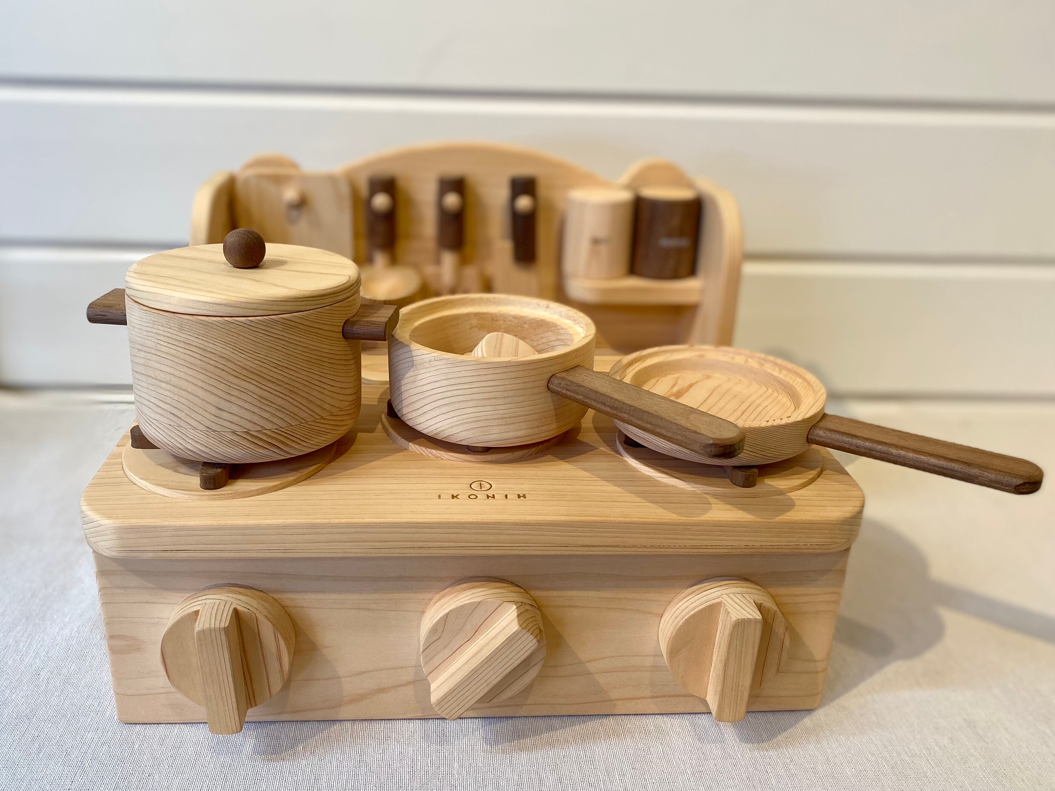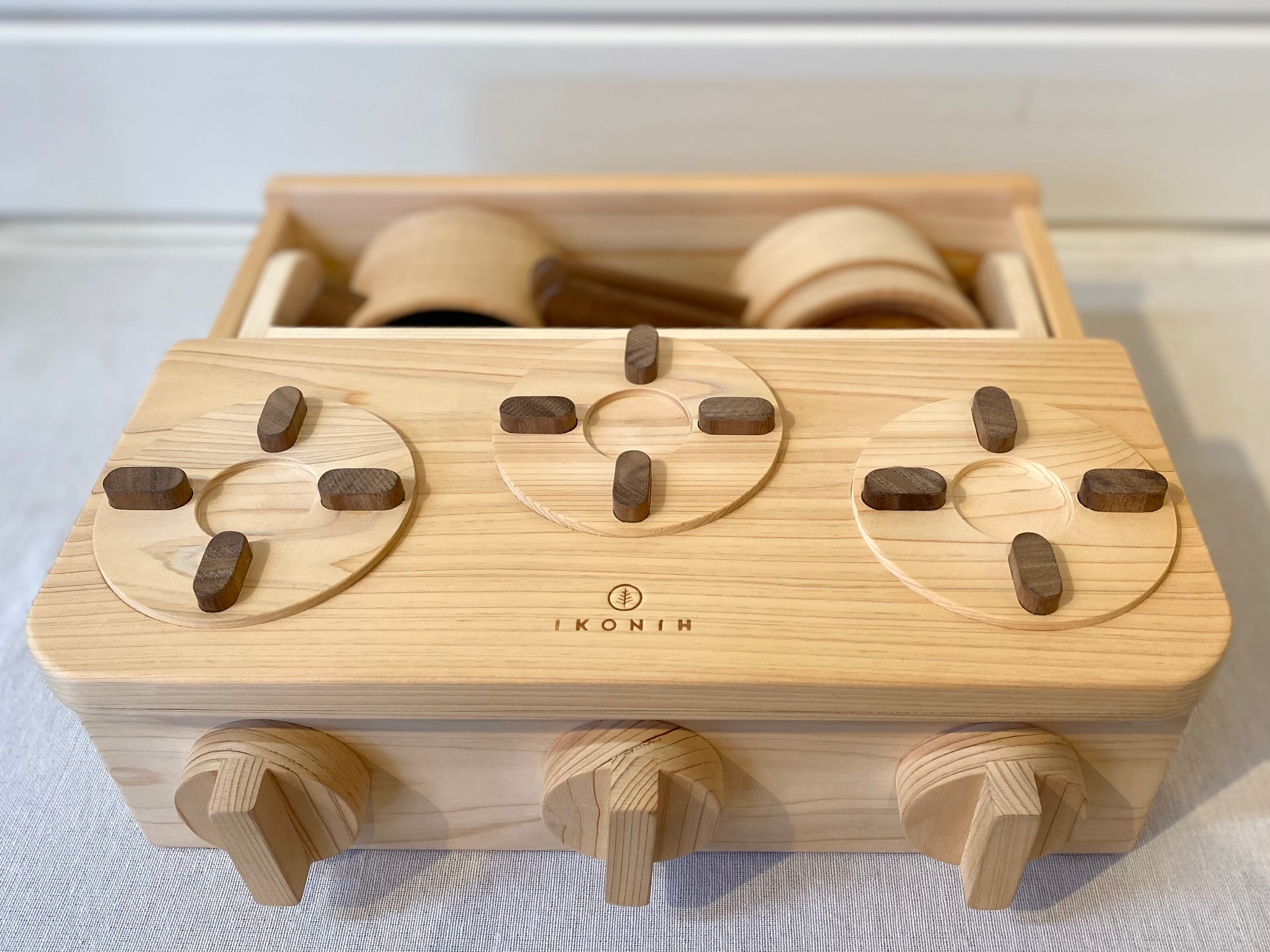 三口のコンロに調理器具、調味料までついたキッチンセットです。